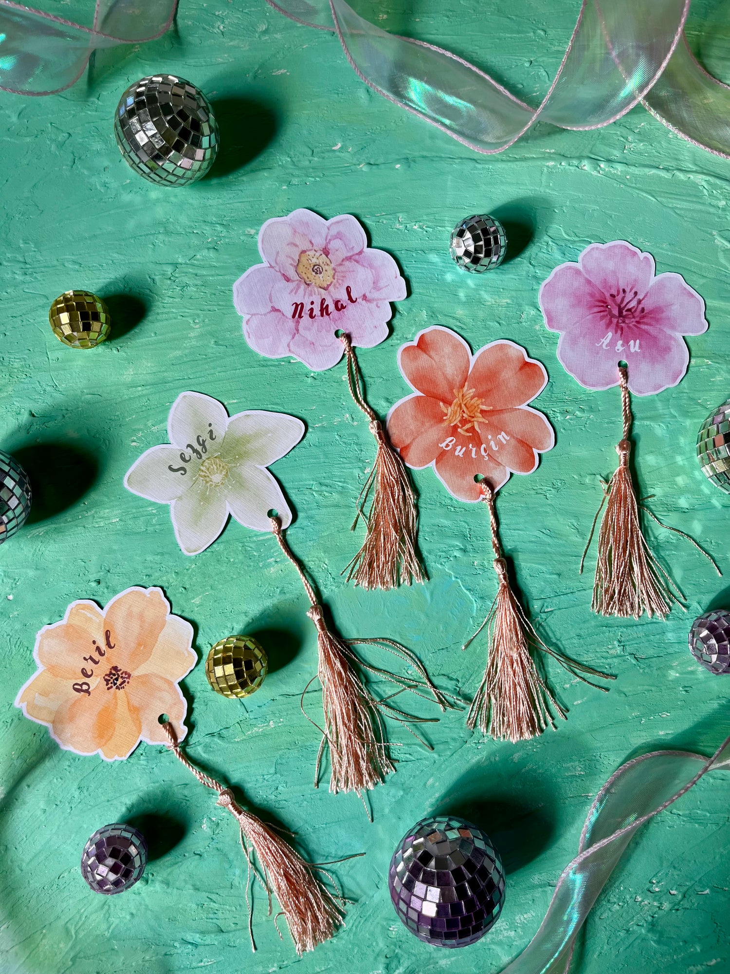 Özel kesimli, aksesuarlı kartlarla renklenen masalar