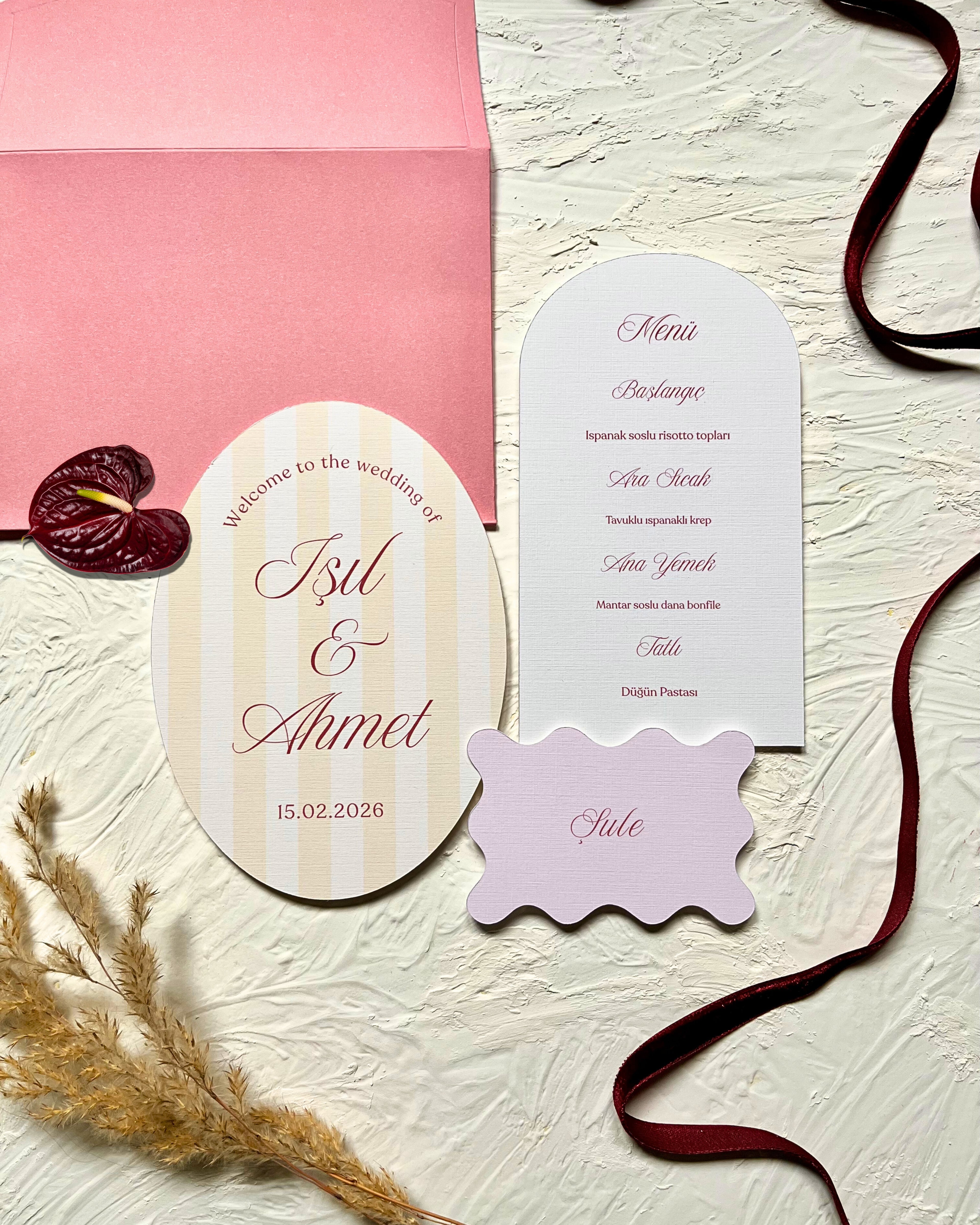 Davetiye & Setler koleksiyonumuz; düğün, nişan, söz ve tüm özel davetler için estetik ve bütüncül bir masa deneyimi sunmak amacıyla hazırlanmıştır. Setlerimiz; davetiye, isim kartı, masa numarası kartı, zarf ve menü kartından oluşur ve konseptinizle uyumlu tek bir tasarım dili içinde sunulur.