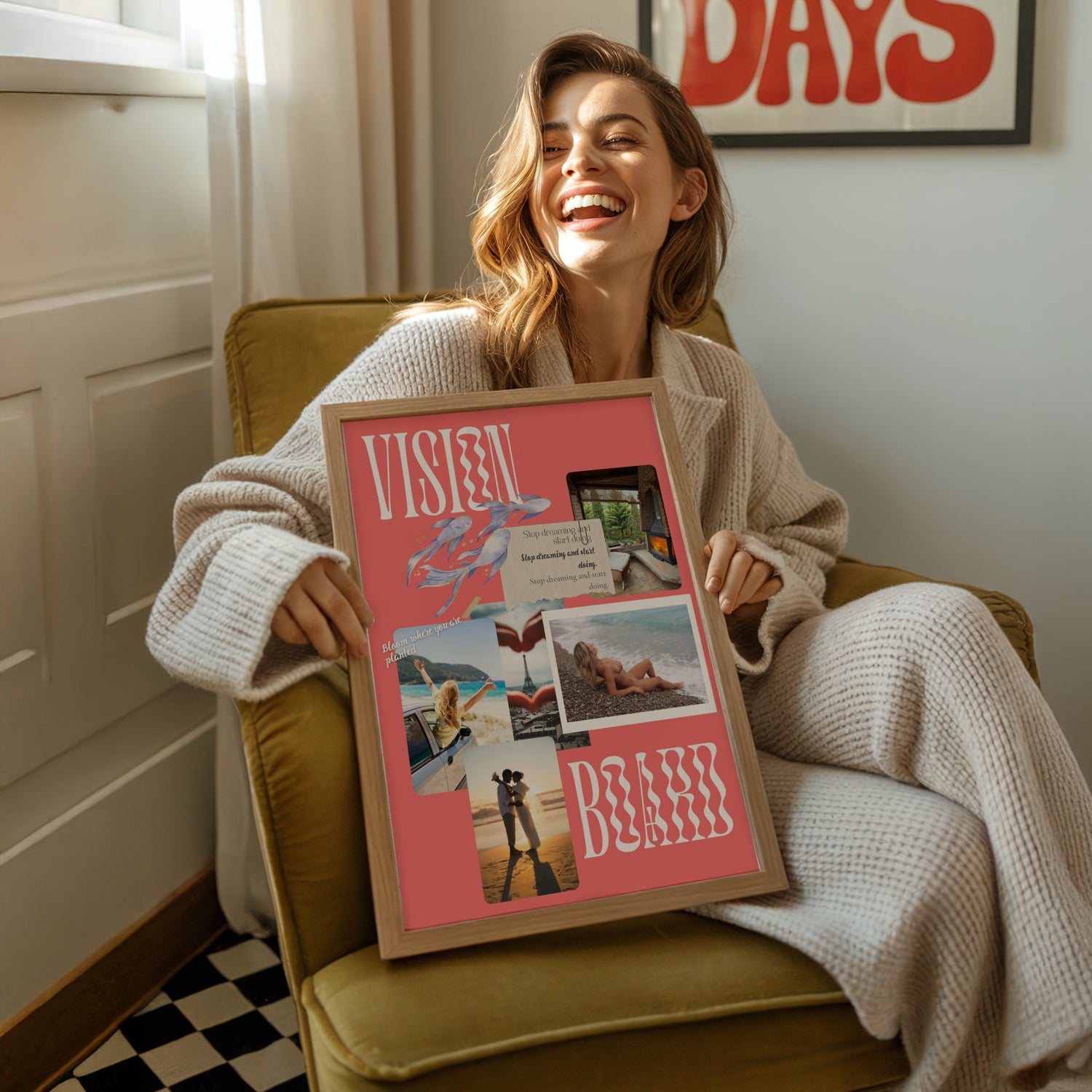Kişiye özel vizyon panosu posterleri, modern, yaratıcı ve trend kolaj tasarım anlayışıyla hazırlanır. Bu vizyon panoları, hem size hayallerinizi ve hedeflerinizi her gün hatırlatarak adım atmanızı sağlayacak dekoratif bir duvar posteri hem de güçlü bir motivasyon kaynağıdır.