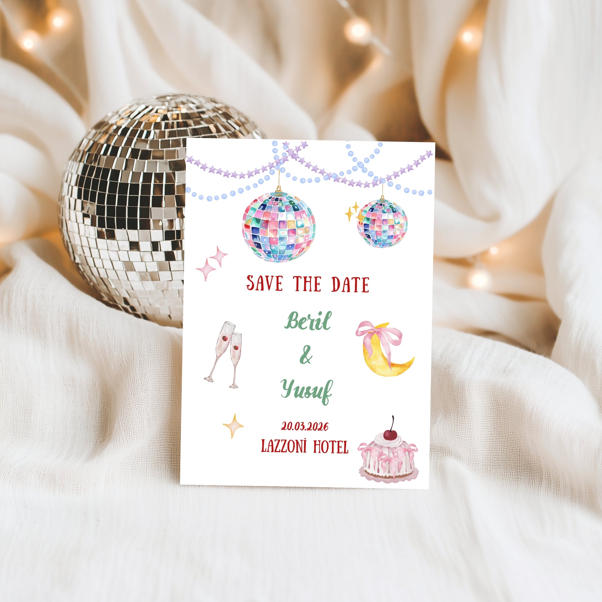 Disco Ball davetiye, düğün, nişan veya davetlerinize neşeli ve stil sahibi bir dokunuş katmak için tasarlandı. Sevimli illüstrasyonları ve modern tipografi detaylarıyla hazırlanan bu tasarım, doğum günü, baby shower, bridal shower, bekarlığa veda, diş buğdayı ve butik etkinlikler için mükemmel bir seçimdir. Dijital suluboya / el çizimi stilindeki figürleri, davetinize hem sıcak hem de karakterli bir atmosfer kazandırır. Kutlama temalı davetiye arayanlar için özgün, yaratıcı ve Instagram’da dikkat çeken bir alternatif sunar.