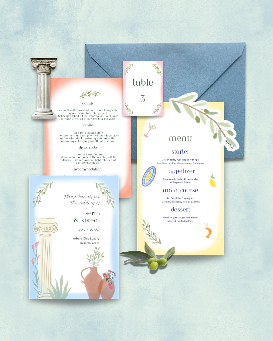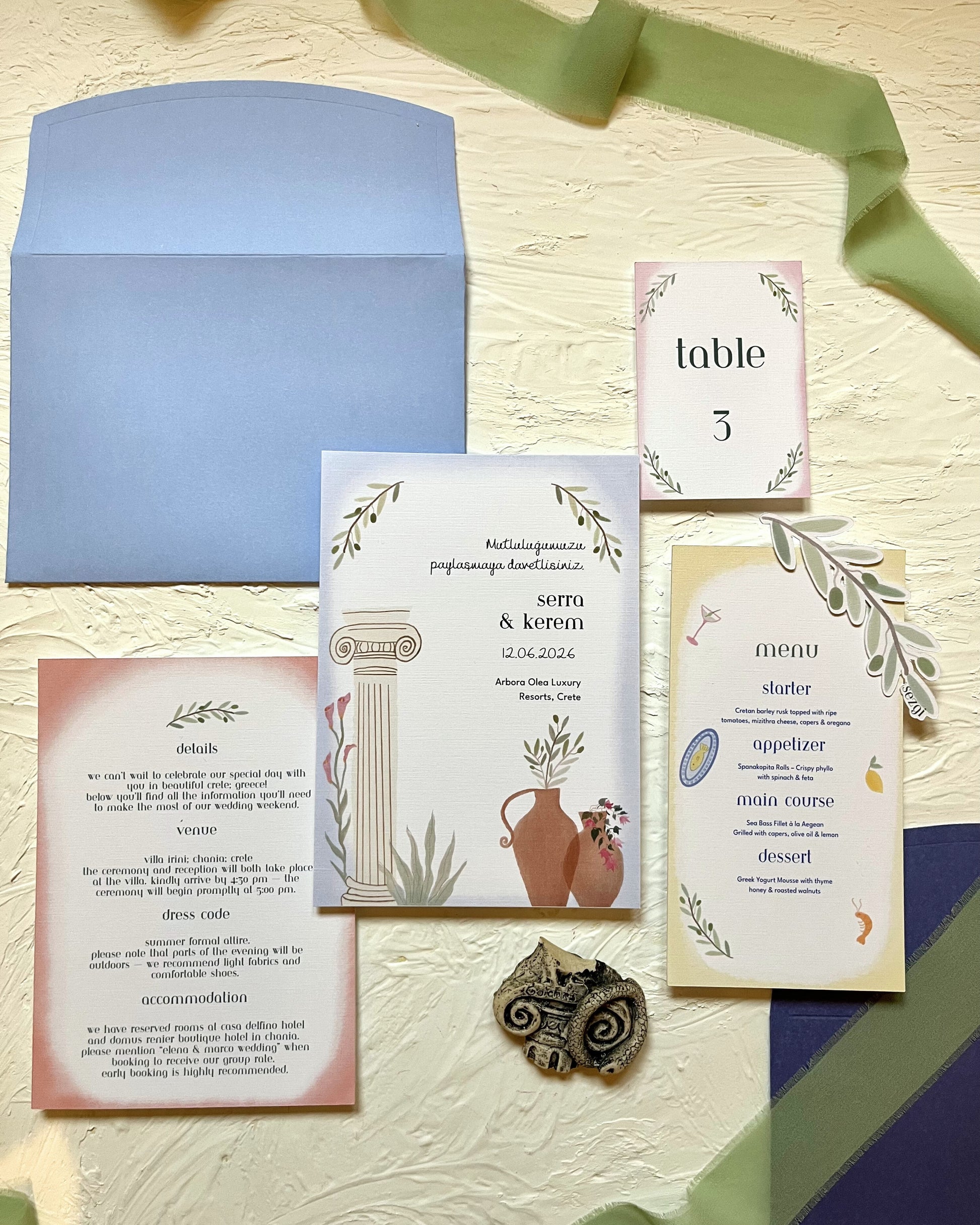 Hellas Davetiye Seti, masa düzeninden davetiye tasarımına kadar tüm detayları uyumlu hale getirerek davet konseptinizi tamamlar. Modern, romantik ve doğal bir stil arayanlar için ideal bir seçimdir.