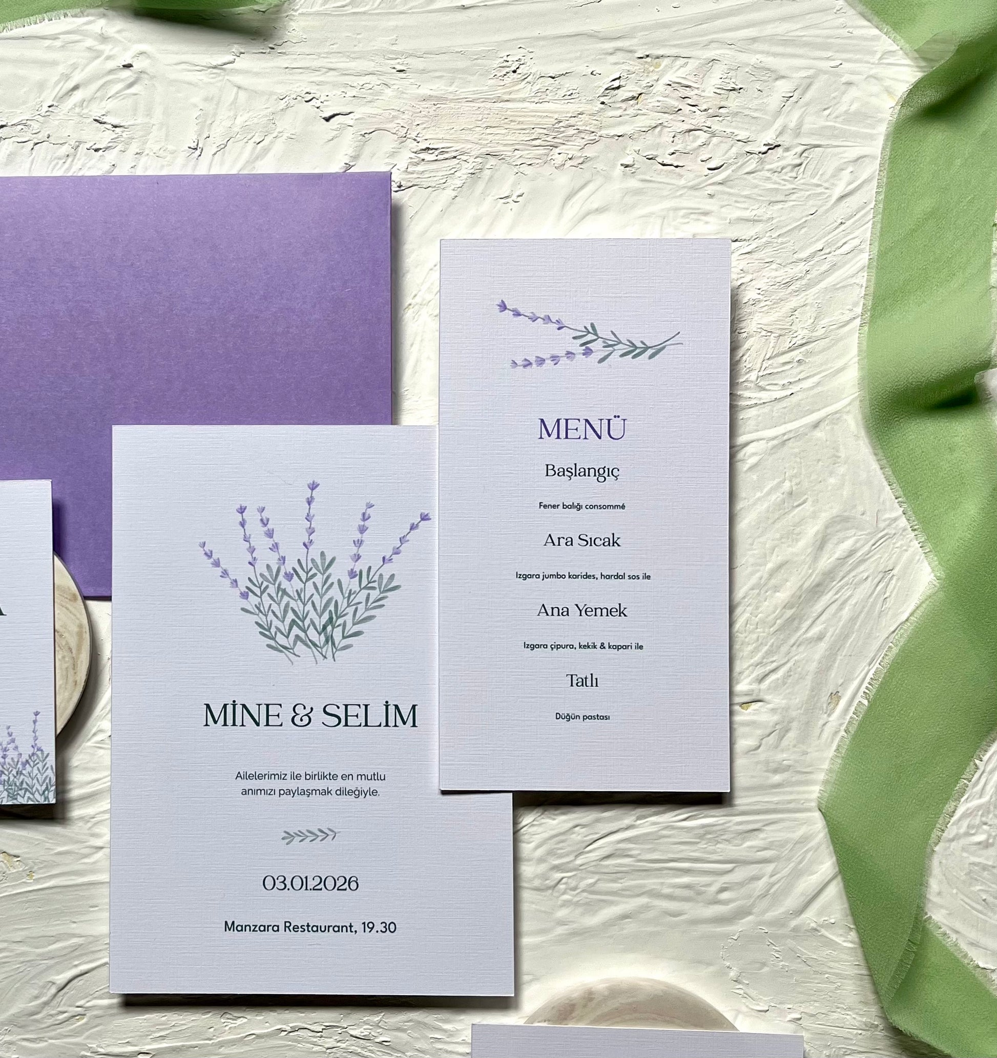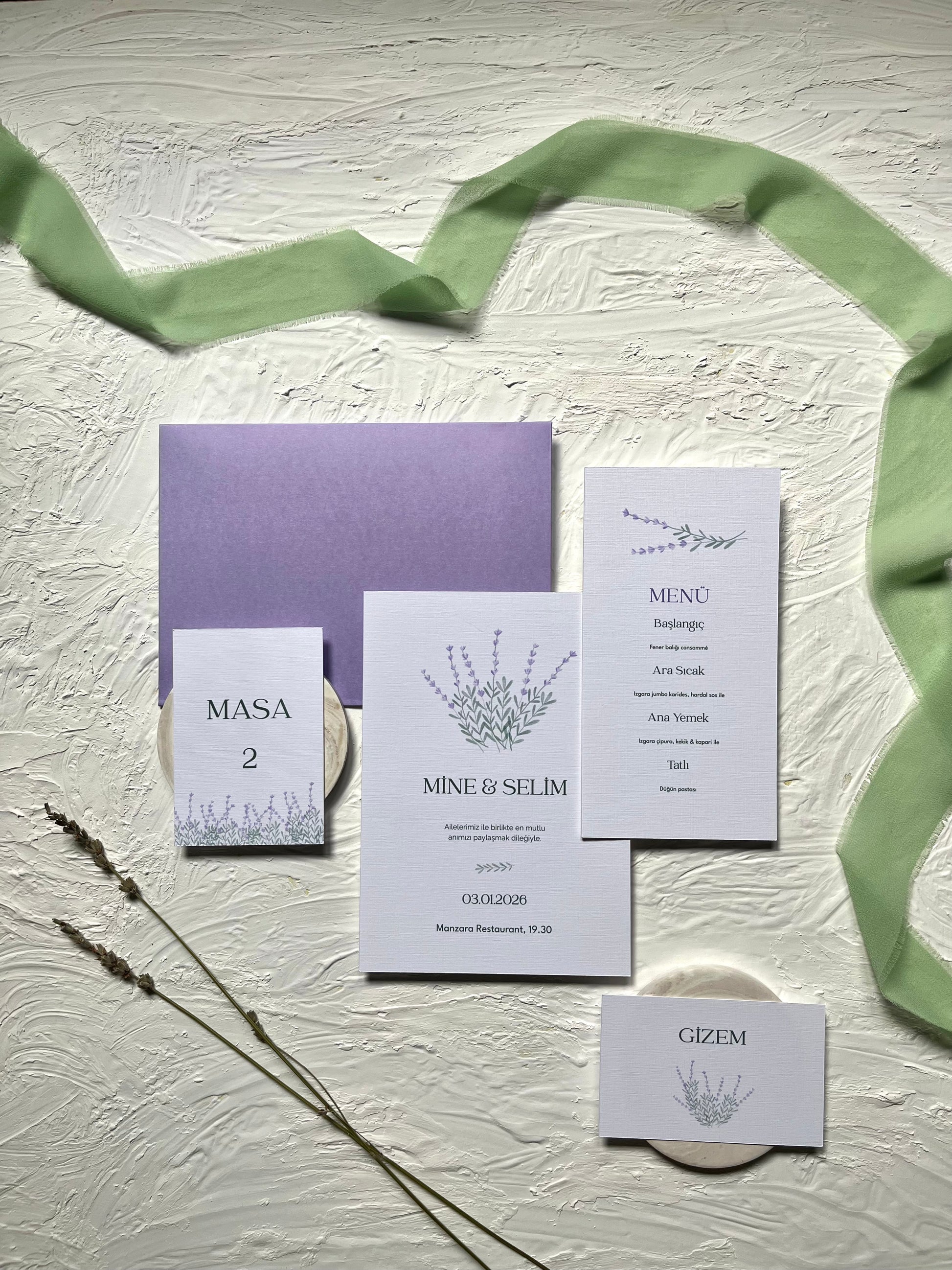 Kişiye özel olarak düzenlenebilen Lavender Davetiye Seti; isim, tarih ve etkinlik detaylarına göre tasarlanır. Estetik, doğal ve romantik bir davetiye arayan çiftler için şık ve bütüncül bir çözüm sunar.